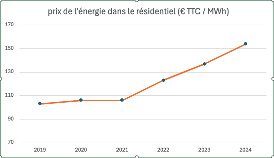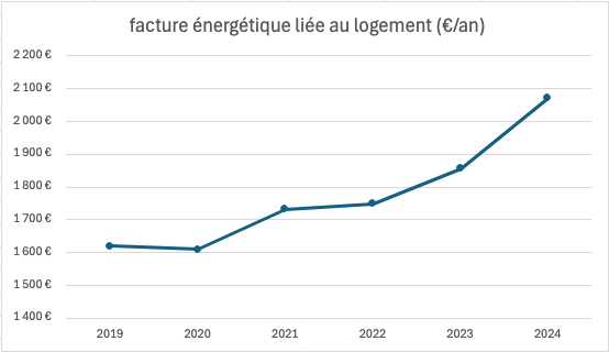 Cette tendance n’est malheureusement pas nouvelle : sur la base des données du SDES, entre 2019 et 2024 les prix de l’énergie sont en hausse de 50%, aggravant ainsi la facture des ménages qui passe de 1 619 € à 2 071 € (les consommations ne diminuant que légèrement entre ces deux années).